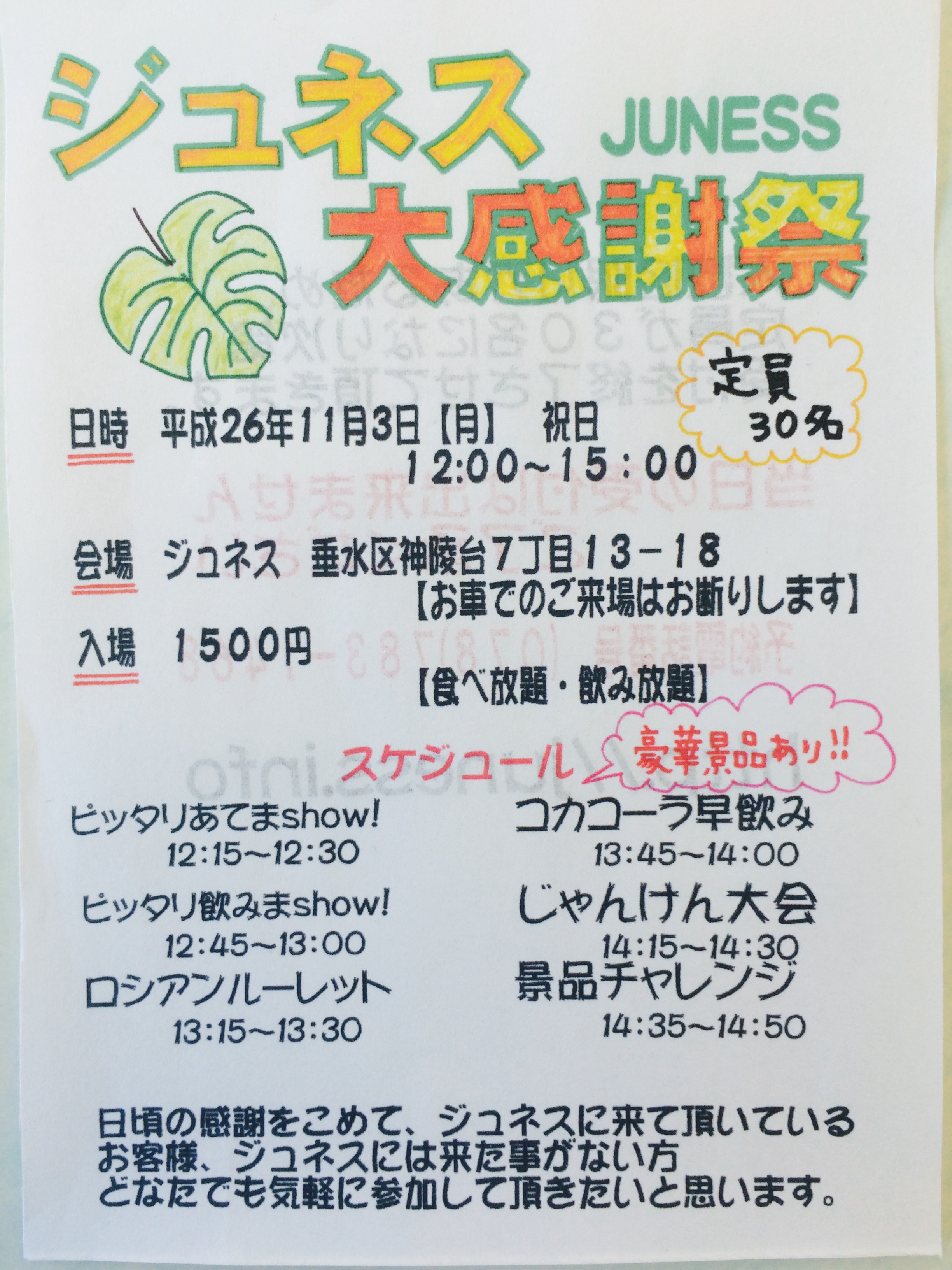 初めての為今回は人数制限を30人とさせて頂いています、参加して頂ける方はお店に感謝祭参加出来るとお電話お待ちしています